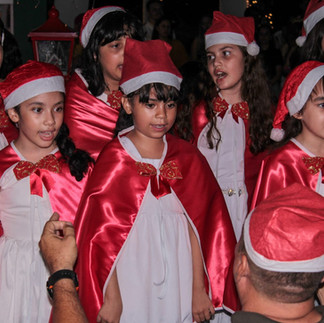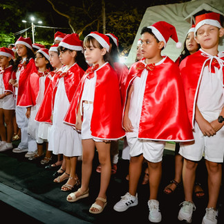 Entre os destaques da decoração estão o balão instalado no centro da praça, a casa do Papai Noel, a casa dos doces, túneis iluminados, presépio e castelo. A programação cultural segue até o dia 6 de janeiro. A apresentação desta quarta-feira foi realizada pelo Coral da Escola Frei Francisco.